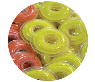 Solid thread made from high quality elastomeric resins. Fresh materials assure long shelf life. Ideal for rotations and retractions.